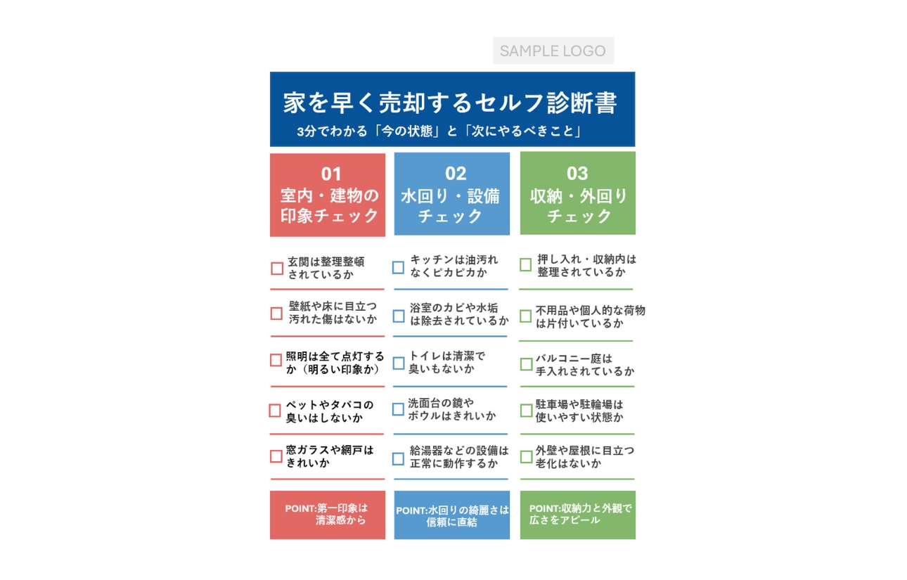 売却のご相談や訪問査定、媒介契約のご説明の中で、「売主様にどう伝えれば分かりやすいだろう?」と感じる場面はありませんか? 本資料は、売主様ご自身がチェックしながら確認できるエンドユーザー向けのセルフ診 ...