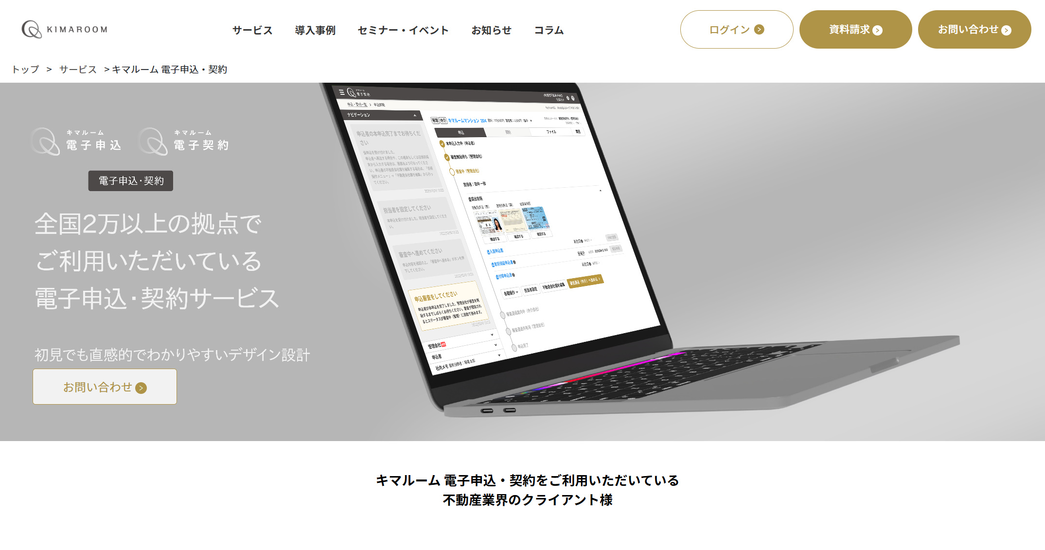 株式会社キマルームのキマルーム 電子申込・契約は、不動産賃貸業務に特化した一気通貫の申込・契約サービスです。
