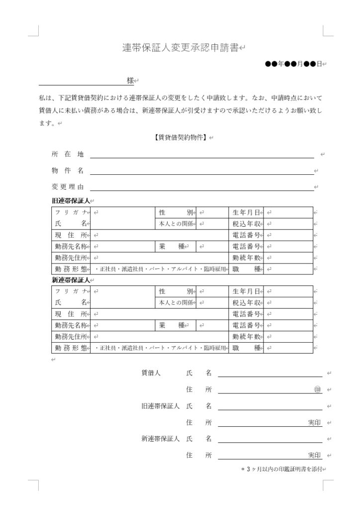 連帯保証人を変更する際に、オーナー(賃貸人)に対して、借主(賃借人)・旧連帯保証人・新連帯保証人の3者が署名捺印し、申請する際に使用する書面です。