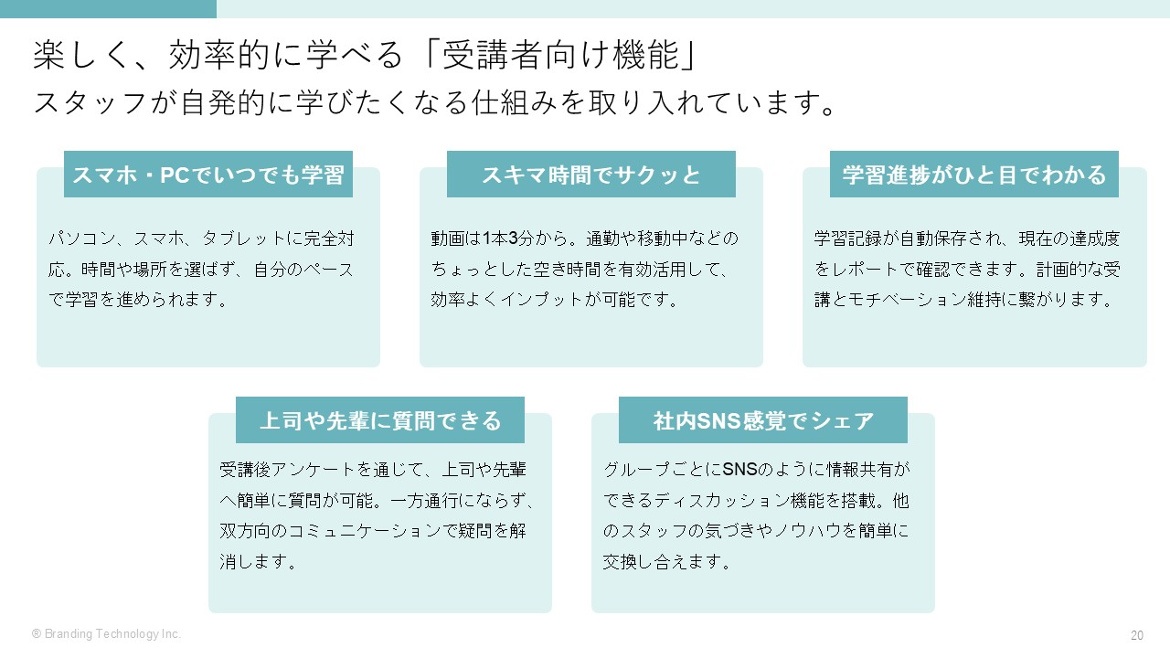 PC・スマホ・タブレットに完全対応。動画は1本3分から視聴できるため、通勤中やスキマ時間、休日など、忙しい営業スタッフでも自分のペースで繰り返し学習が可能です。