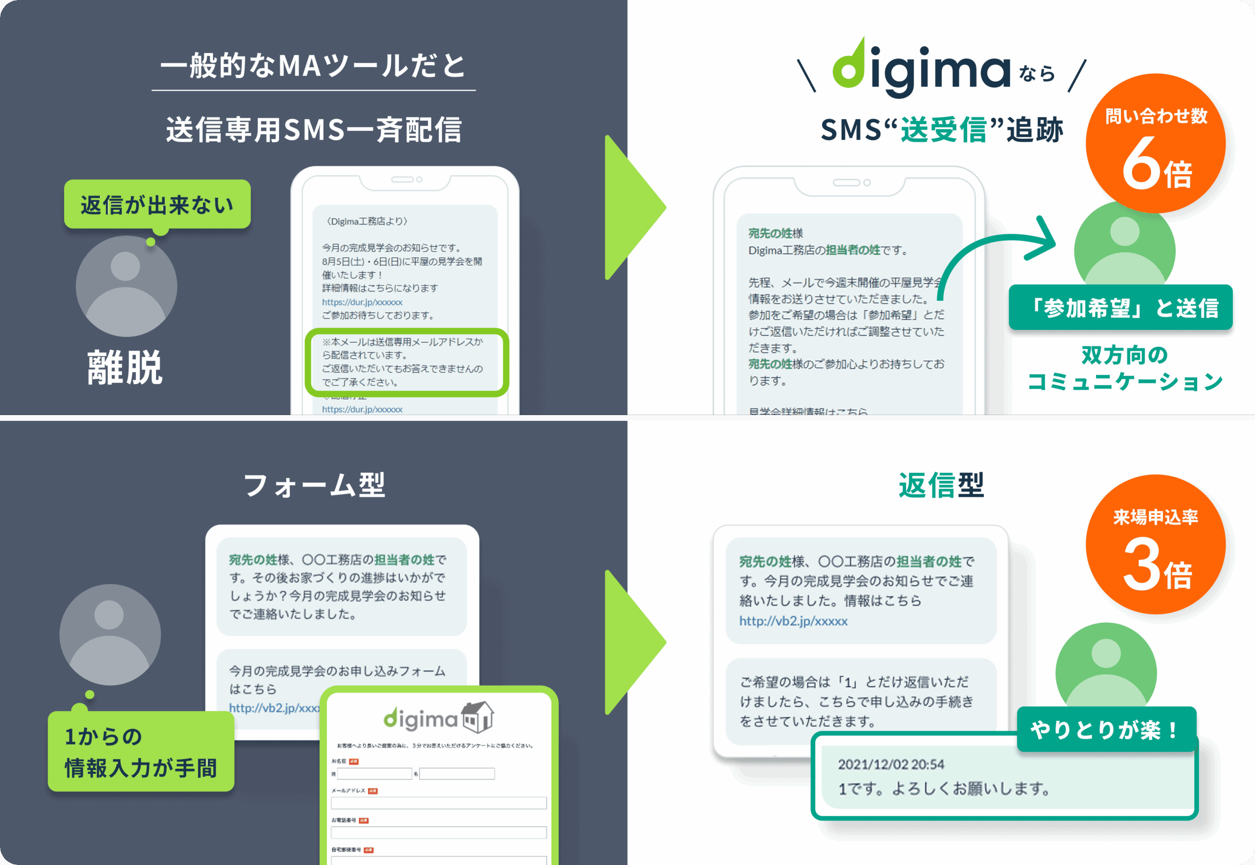 Digimaは一方通行の一斉配信ではなく、返信・応答を前提とした自動化設計。