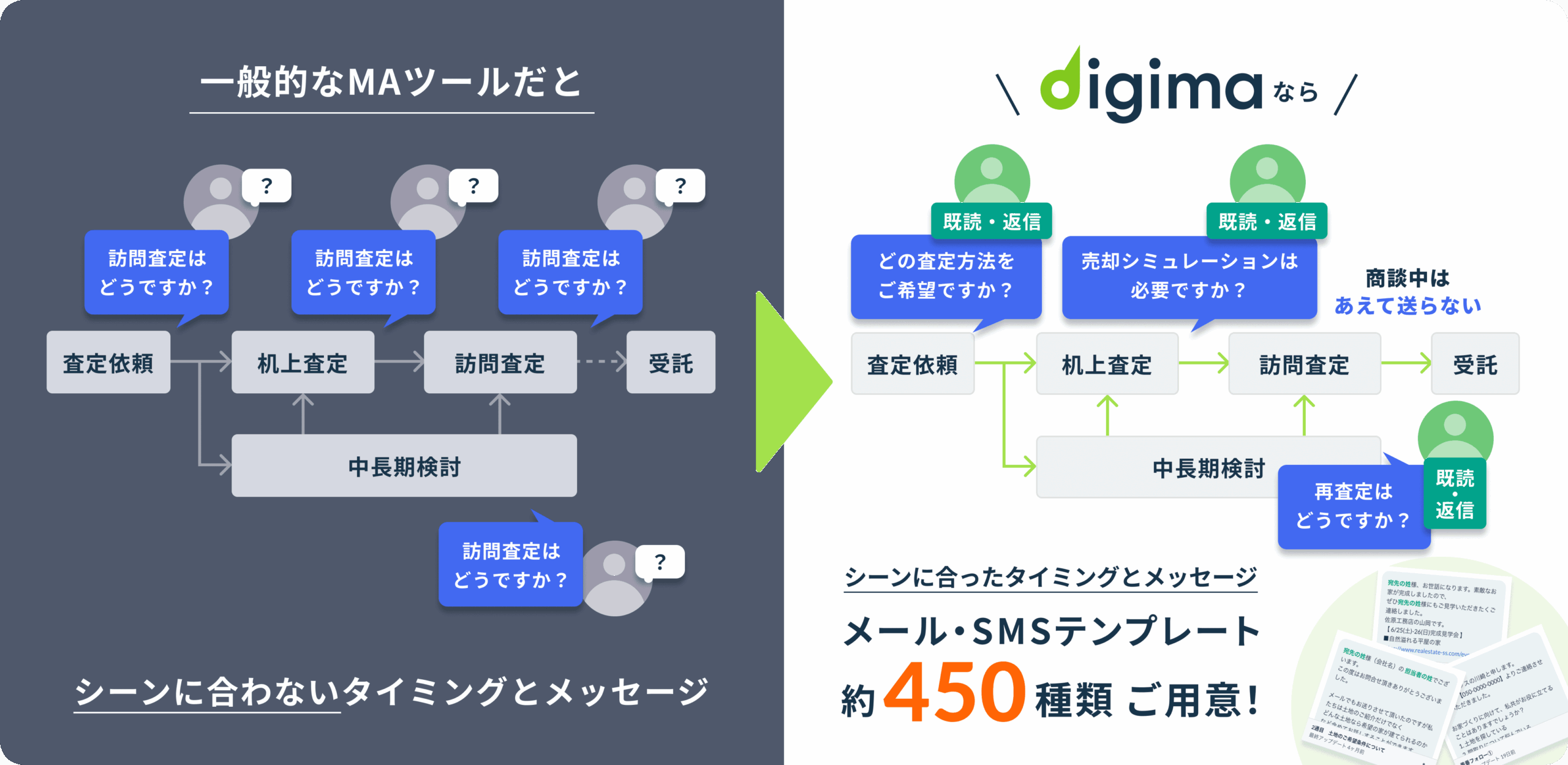 以前の「属人的」な営業から、「分業」体制へシフトしたのが鍵です。DigimaのSMSやメールといった「デジタルフォロー」と、毎月のダイレクトメールの「アナログフォロー」を組み合わせることで、時間をかけてじっくり検討したいお客様へ、漏れなく長期的なフォローを実現。その結果、私たちを信頼し、納得した上で選んでくださるお客様が劇的に増えました。