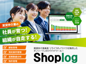 業務基盤・運用改善賃貸仲介事業の売上を伸ばす業務支援システム「Shoplog」●創業10年で24店舗まで拡大したリライフが自社の為に作ったシステム!だから効果が実感できる! ●物件管理、顧客管理、契約案件顧客管理(CRM)コンバーター営業数値分析