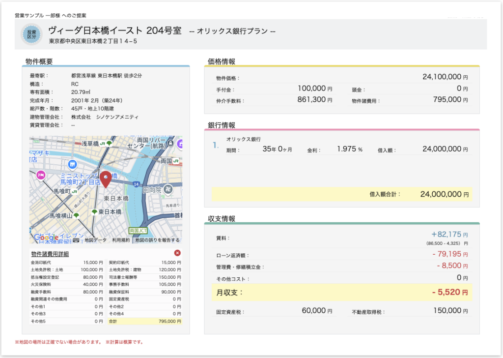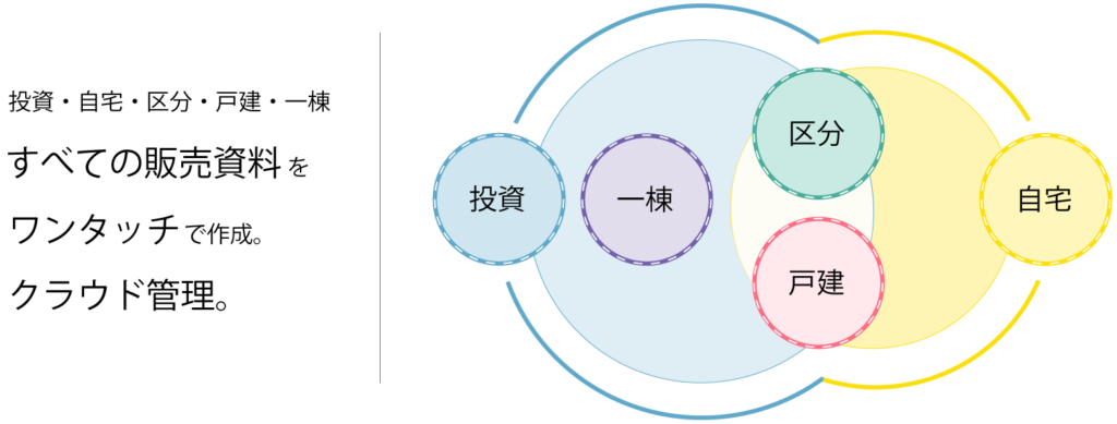 物件種別、購入目的を問わず、不動産の営業に必要な要素が詰まった販売資料が瞬時に作成できます