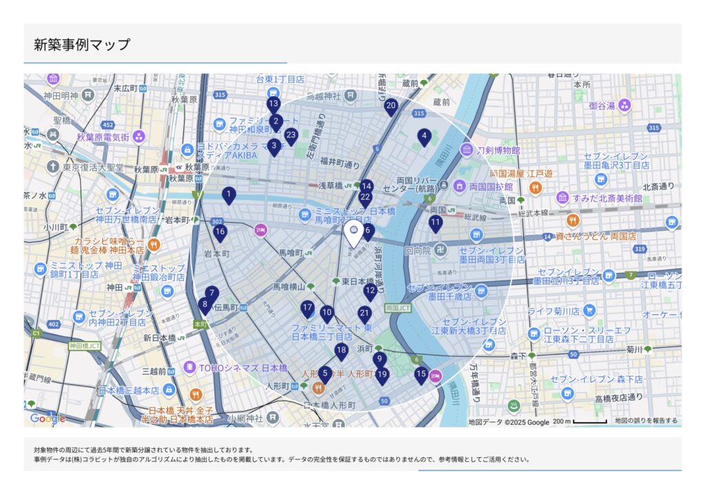 新築・中古事例・公示価格推移等、17の解析をレポートにして瞬時に出力