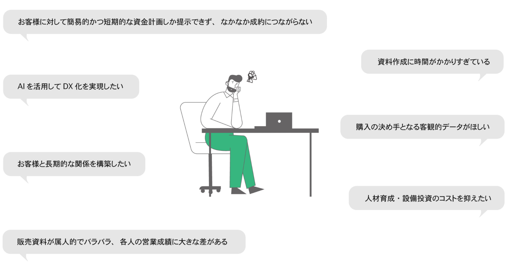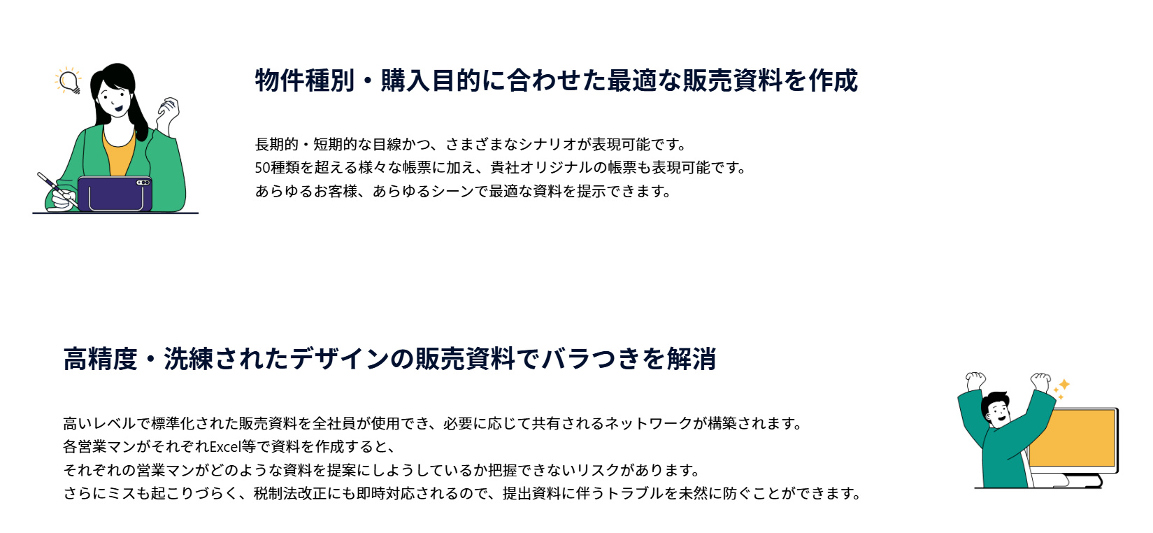 | 資料作成の時間が膨大 | 物件種別・購入目的に合わせた最適な販売資料を瞬時に作成可能 |