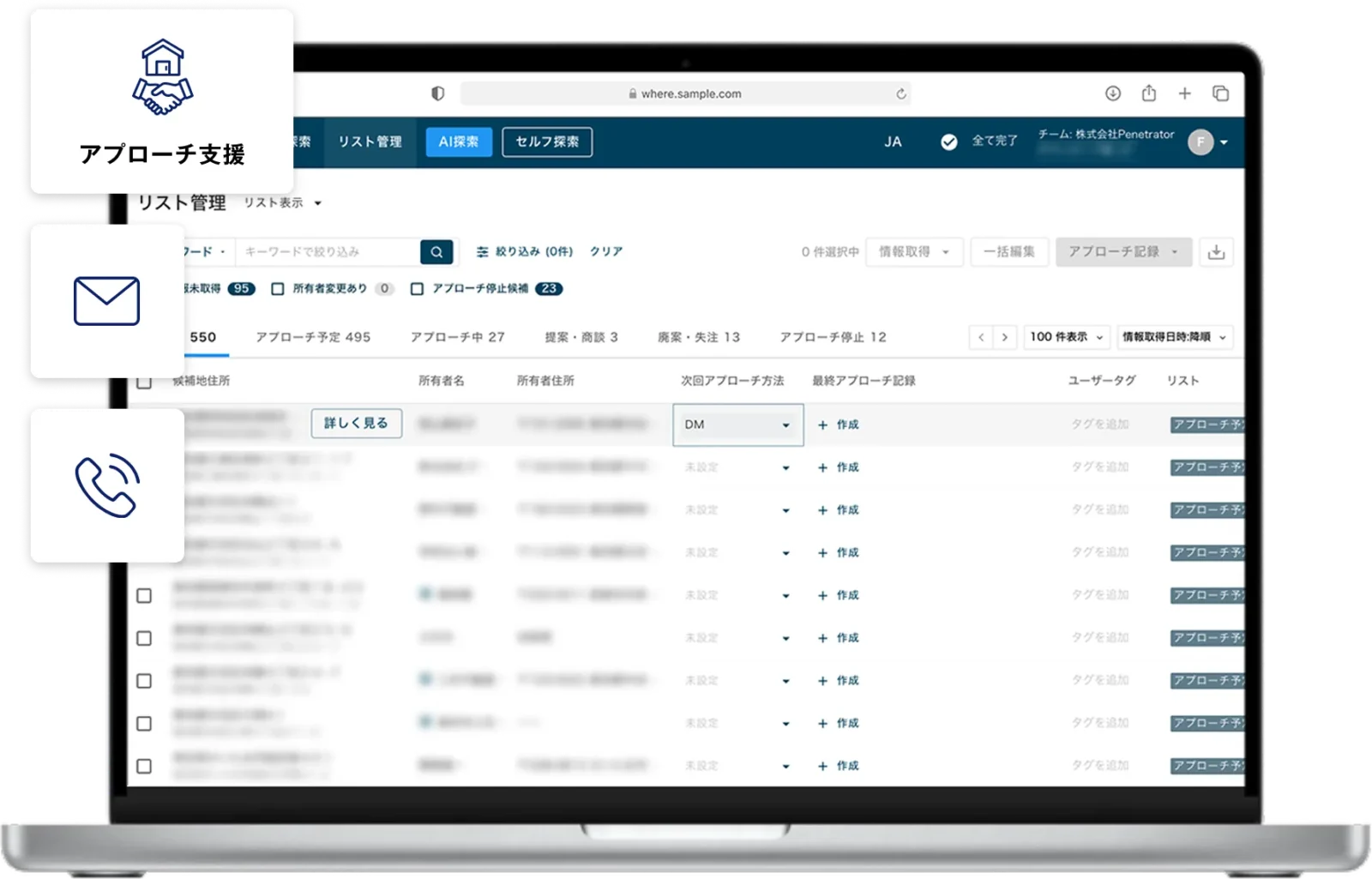 WHEREの支援は、アプローチにまで及びます。業界平均の20倍以上の返信率を誇るDMメソッドや電話がけ支援、コネクション営業の支援を通して不動産の仕入れができるまでのすべてのプロセスを強力にサポートします。