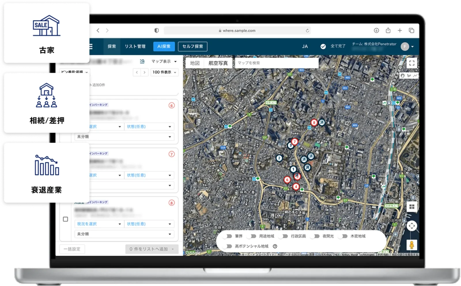 衛星データだから発見できる「空き地」「駐車場」「古屋根」などの現況情報、相続/差押などの登記情報、衰退産業や競合企業などのWeb情報、独自データベースを組み合わせ、会社ごとに必要な不動産をAIが高速に見つけ出します。