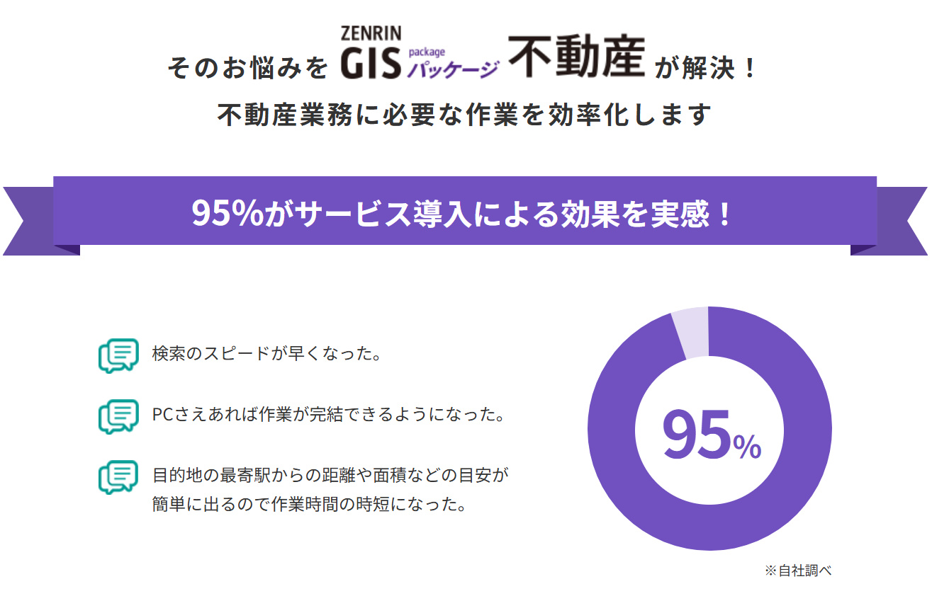ZENRIN GIS パッケージ 不動産は、不動産業務に欠かせない地図情報と様々なコンテンツをパソコン1台で閲覧・検索できるため、物件調査にかかる手間を大幅削減します。