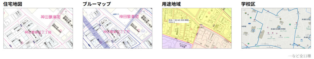 不動産業務に役立つ豊富な地図情報を、住宅地図に重ね合わせて確認できるため調査効率が格段にアップします。